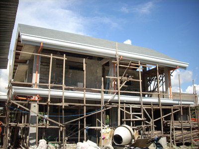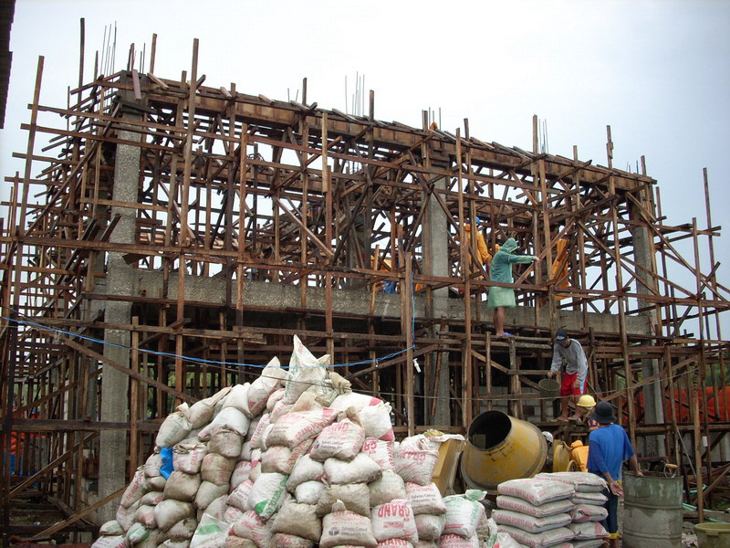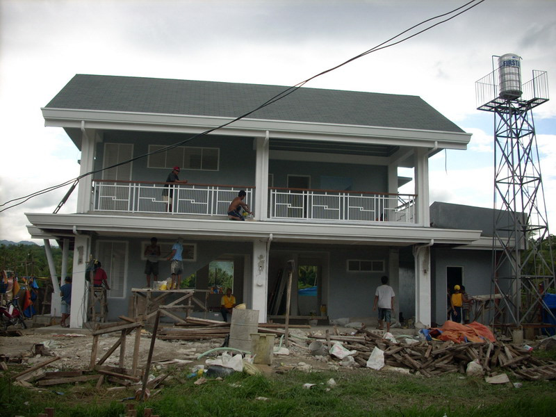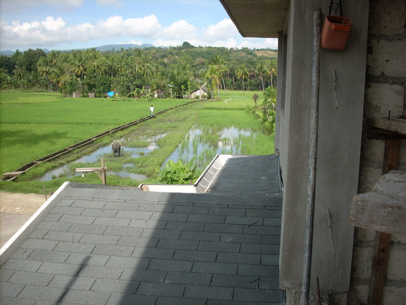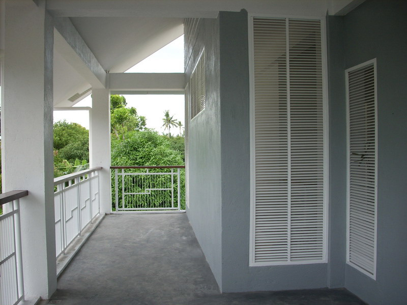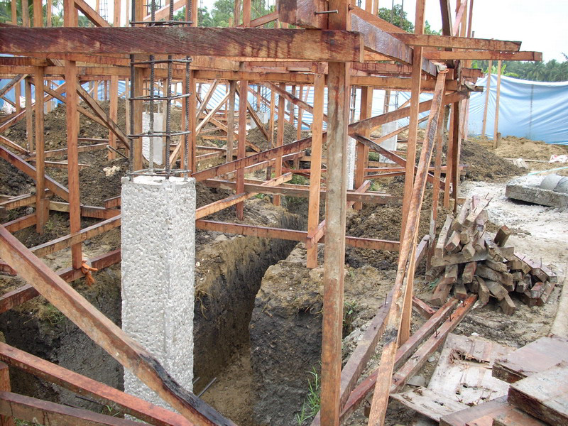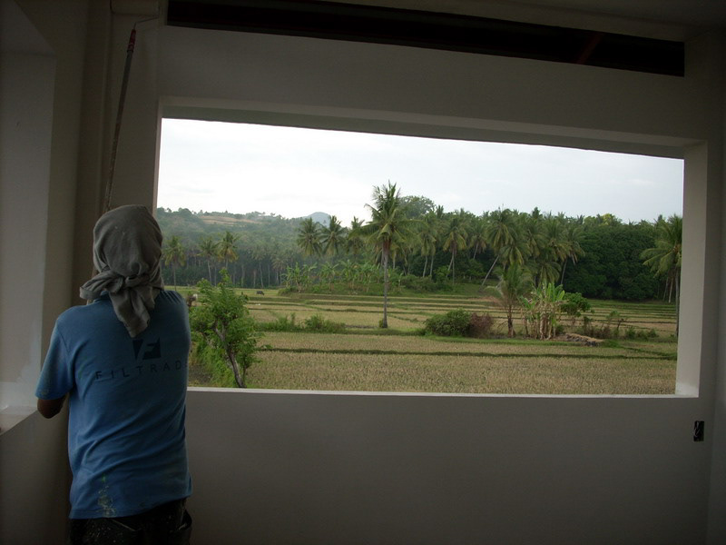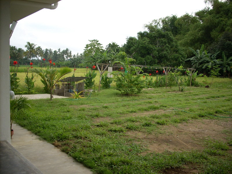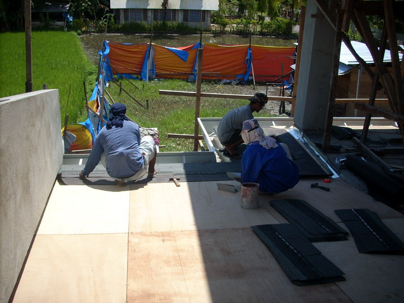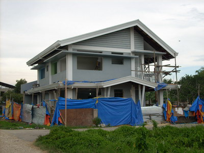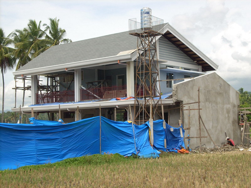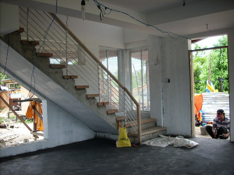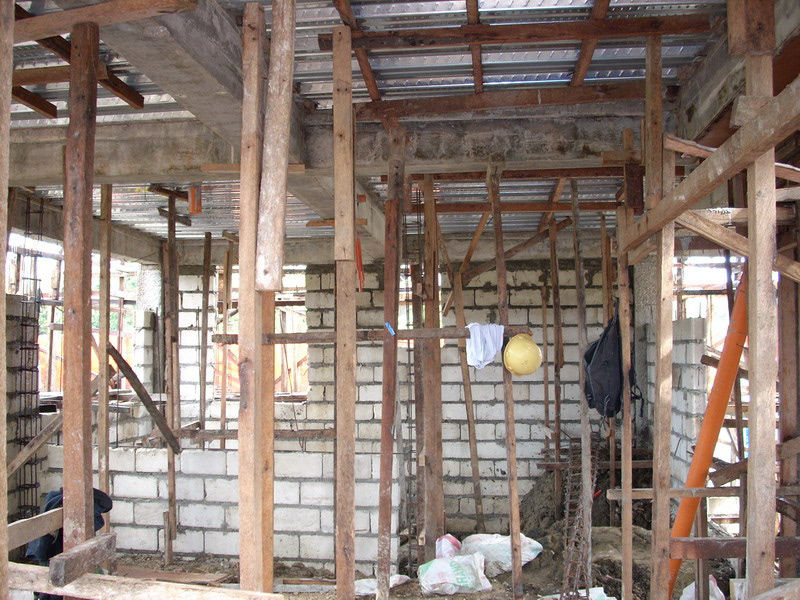 Nachdem alle nötigen Papiere zum Erwerb des Grundstücks erledigt waren, konnte endlich die Planung begonnen werden. Ursprünglich sollte es ein kleines, einfaches Häuschen werden, aber beim Planen erscheinen die Räume so winzig und immer als zuwenig. Dabei kommt man als Urlaubsgast im Normalfall mit einem kleinen Schlafzimmer und Bad aus. Am Ende der Planungsreihe stand ein Haus mit etwa 190 m² Gesamtgrundfläche, darin sind allerdings die beiden großzügigen Terrassen enthalten. Hier nun die Grafiken, welche die fertige Ansicht simulieren. Ganz unten finden Sie den Grundriß. It took a long time to finish the title for the lot, but then, planning started. In the beginning it should have been a small house, but while planning all rooms appeared so small. Usually one small room with bath is enough for a traveller. At the end of planning we stood at a house of 190 m², including the two terraces. Here is a simulation of the planned house and the floorplan. Im November 2007 begannen die Arbeiten am 567 m² Grundstück, auf einem ehemaligen Reisfeld am Ortsrand. Im Juni 2008 war das Haus bezugsfertig.