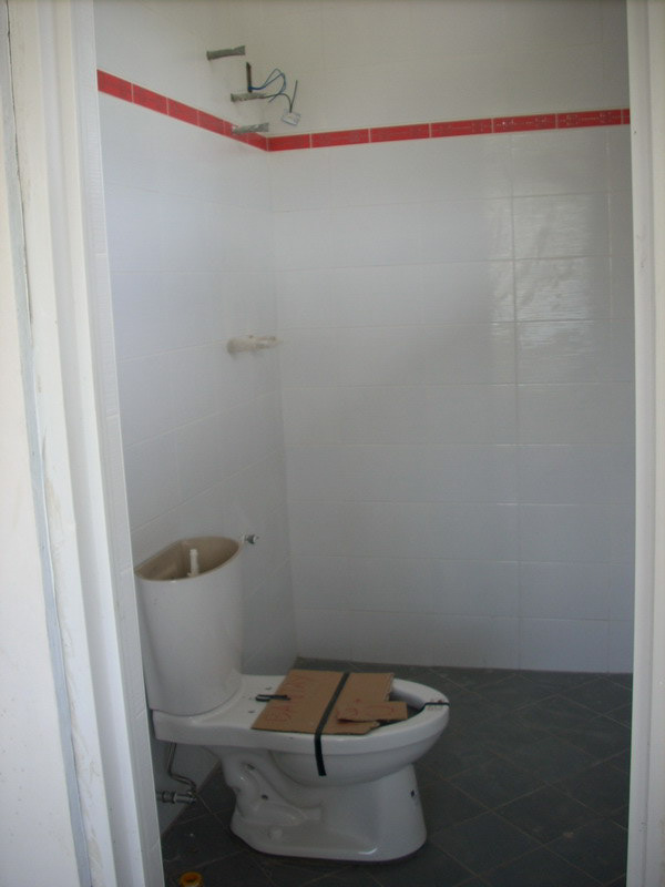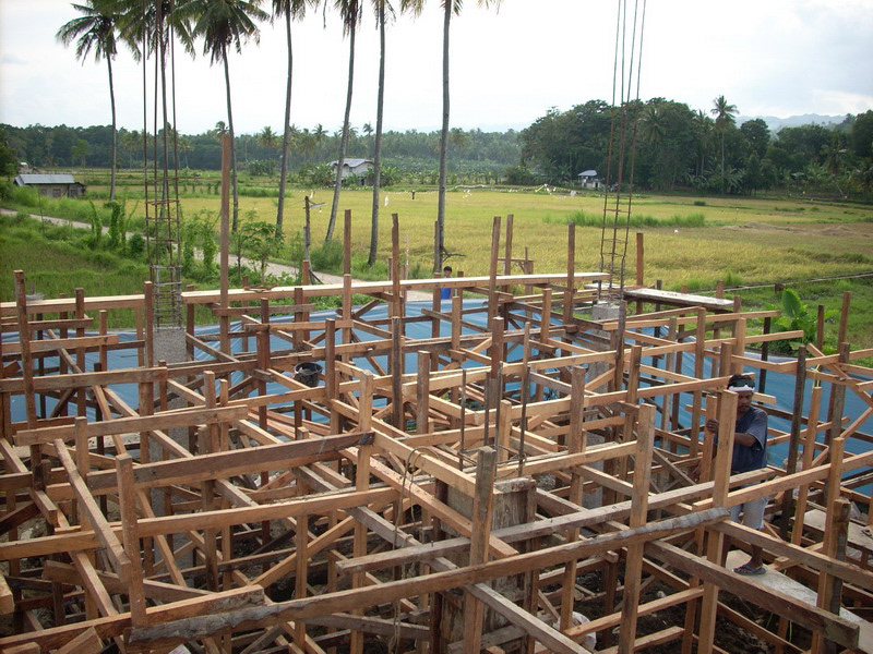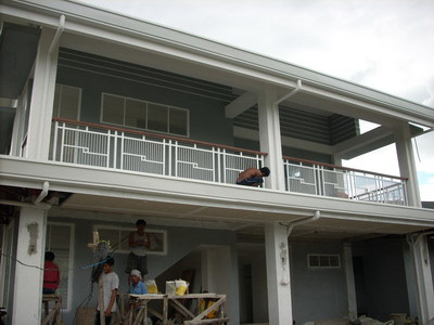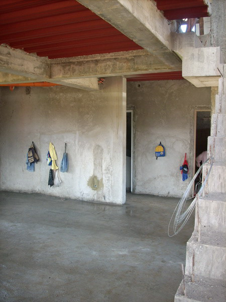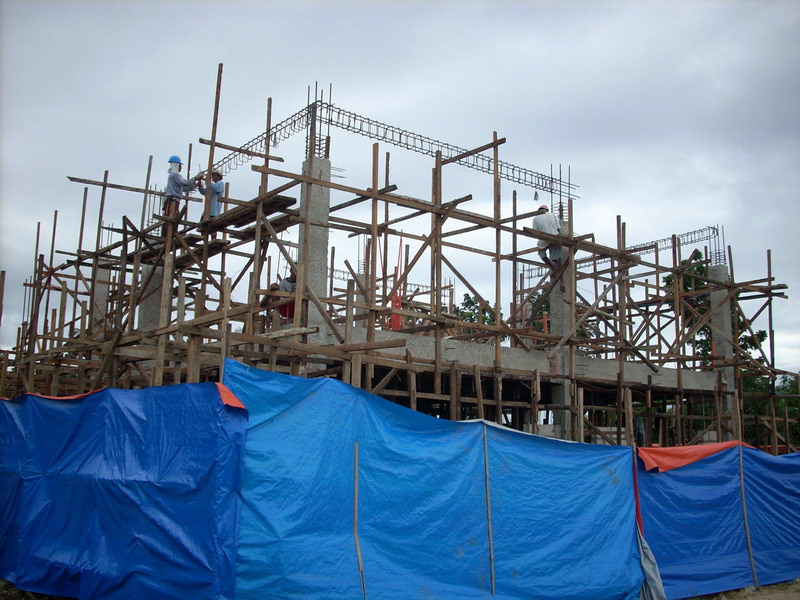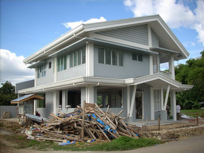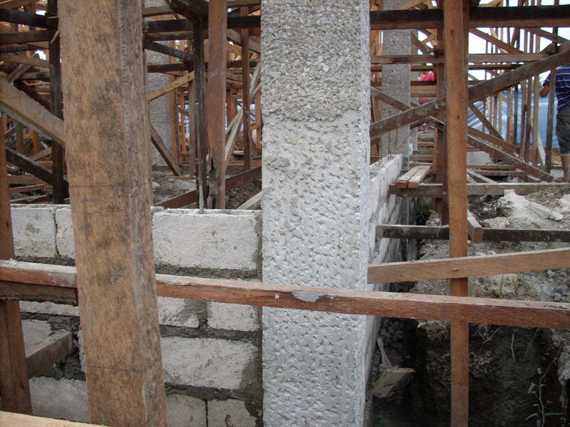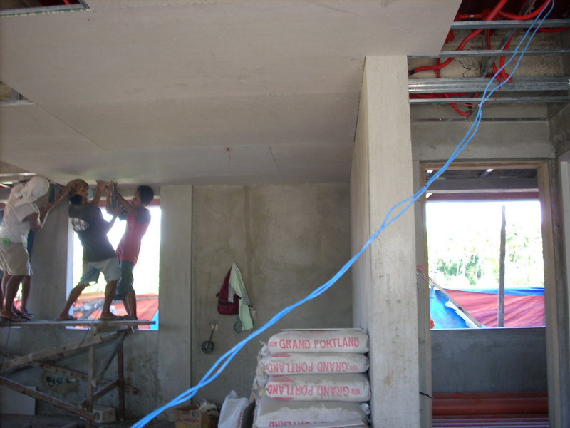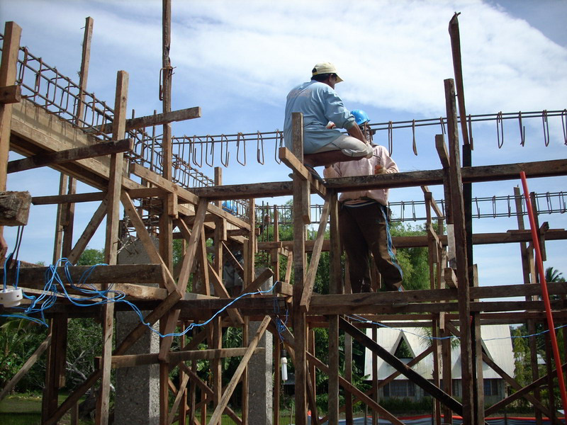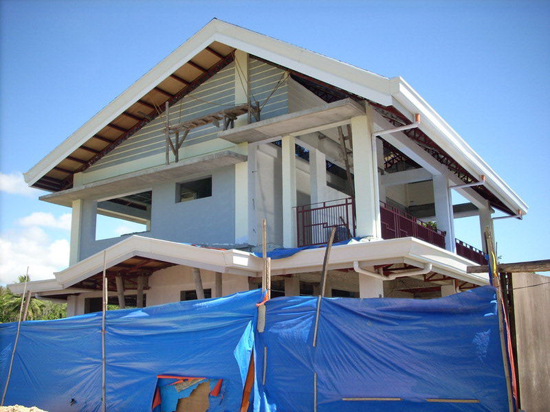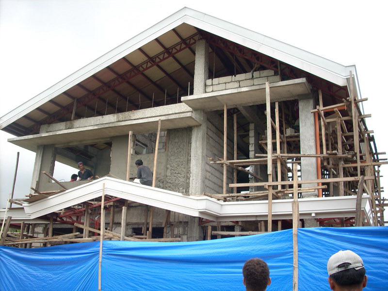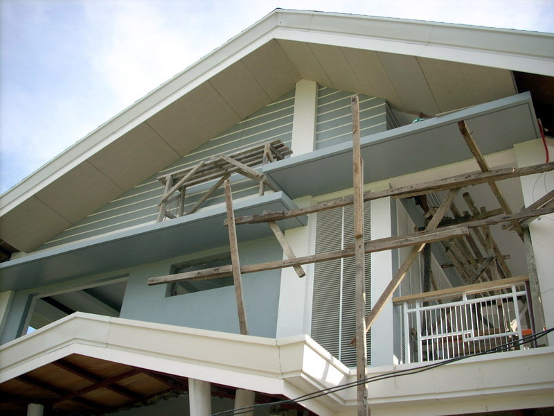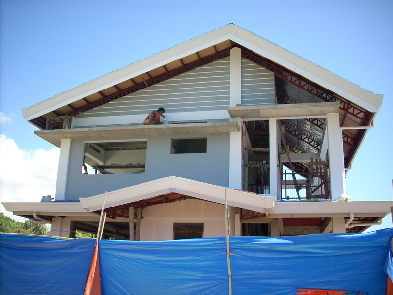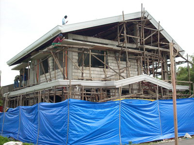 Nachdem alle nötigen Papiere zum Erwerb des Grundstücks erledigt waren, konnte endlich die Planung begonnen werden. Ursprünglich sollte es ein kleines, einfaches Häuschen werden, aber beim Planen erscheinen die Räume so winzig und immer als zuwenig. Dabei kommt man als Urlaubsgast im Normalfall mit einem kleinen Schlafzimmer und Bad aus. Am Ende der Planungsreihe stand ein Haus mit etwa 190 m² Gesamtgrundfläche, darin sind allerdings die beiden großzügigen Terrassen enthalten. Hier nun die Grafiken, welche die fertige Ansicht simulieren. Ganz unten finden Sie den Grundriß. It took a long time to finish the title for the lot, but then, planning started. In the beginning it should have been a small house, but while planning all rooms appeared so small. Usually one small room with bath is enough for a traveller. At the end of planning we stood at a house of 190 m², including the two terraces. Here is a simulation of the planned house and the floorplan. Im November 2007 begannen die Arbeiten am 567 m² Grundstück, auf einem ehemaligen Reisfeld am Ortsrand. Im Juni 2008 war das Haus bezugsfertig.